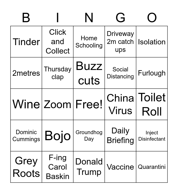 This bingo card has a free space and 30 words: F-ing Carol Baskin, Joe Exotic, Zoom, Tik-Tok, Tinder, Home Schooling, Thursday clap, Groundhog Day, China Virus, Donald Trump, Toilet Roll, Quarantini, Vaccine, Testing, Furlough, Disney Plus, Daily Briefing, Dominic Cummings, Bojo, Isolation, Wine, More Wine, Click and Collect, Social Distancing, 2metres, Driveway 2m catch ups, Inject Disinfectant, Grey Roots, Buzz cuts and Coronavirus.