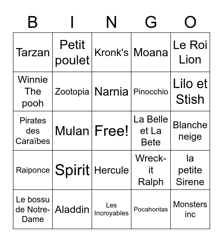 This bingo card has a free space and 31 words: Les Incroyables, Frozen, Mulan, Livre de la jungle, Tarzan, Kronk's, Zootopia, Wreck-it Ralph, La Belle et La Bete, Pocahontas, Blanche neige, Monsters inc, Star Wars, Up, Lilo et Stish, Coco, la petite Sirene, Spirit, Raiponce, Hercule, Le Roi Lion, Les Aristochats, Le bossu de Notre-Dame, Petit poulet, Pinocchio, Winnie The pooh, Moana, Pirates des Caraïbes, Aladdin, Narnia and Volt.