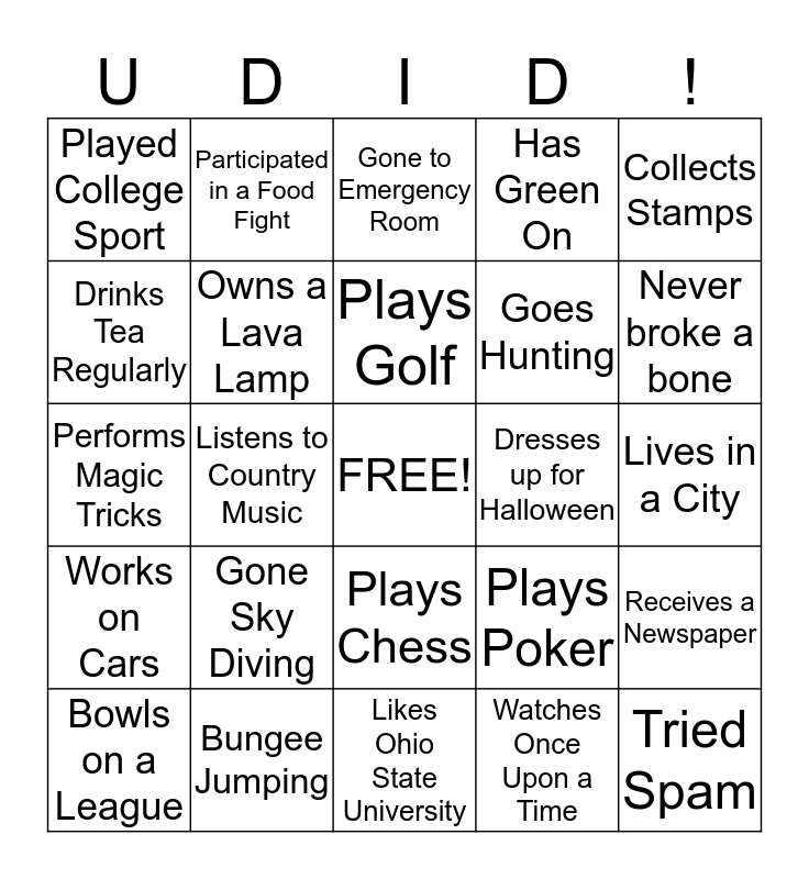 This bingo card has a free space and 24 words: Gone Sky Diving, Bungee Jumping, Plays Golf, Bowls on a League, Collects Stamps, Played College Sport, Drinks Tea Regularly, Participated in a Food Fight, Dresses up for Halloween, Plays Chess, Goes Hunting, Performs Magic Tricks, Plays Poker, Receives a Newspaper, Owns a Lava Lamp, Watches Once Upon a Time, Lives in a City, Gone to Emergency Room, Never broke a bone, Listens to Country Music, Tried Spam, Works on Cars, Has Green On and Likes Ohio State University.