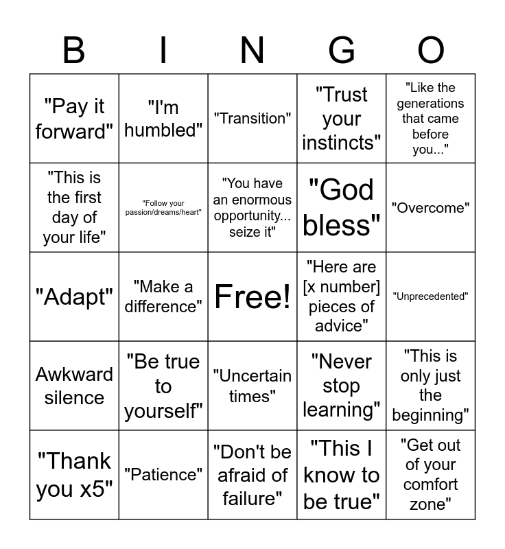 This bingo card has a free space and 50 words: "It is a great honor", "Get out of your comfort zone", "Here's the secret...", "Don't be afraid of failure", "Be true to yourself", "Good luck!", "I'm humbled", "...as you embark on the next phase of your life", "This is the first day of your life", "Be the change you wish to see in the world", "Follow your passion/dreams/heart", "Trust your instincts", "This is only just the beginning", "Never stop learning", "Do good", "Live your life", "You have an enormous opportunity... seize it", "Here are [x number] pieces of advice", "The future is yours to shape", "Like the generations that came before you...", "Make a difference", "This I know to be true", "Pay it forward", "God bless", "Brave", "New technologies", "Overcome", "First in innovation", "Transition", "Uncertain times", "Zoom x3", "Historic", "Never seen before", "Industry-Leading", "Patience", "Challenging", "Quickly sprung into action", "Proud", "Sacrifice", "Unprecedented", "Defy", "Our hearts go out", "Determination", "Thriving", "Thank you x5", "Adapt", "Working day and night", Quote from Trump, Awkward silence and Spot a family with embarrassing sign.