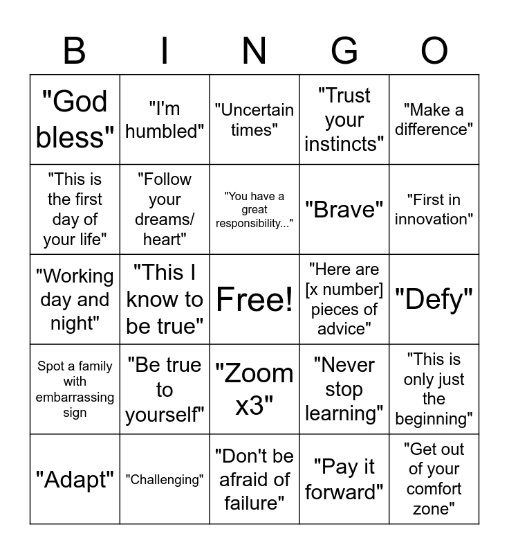 This bingo card has a free space and 50 words: "It is a great honor", "Get out of your comfort zone", "Here's the secret...", "Don't be afraid of failure", "Be true to yourself", "Good luck!", "I'm humbled", "...as you embark on...", "This is the first day of your life", "Be the change you wish to see in the world", "Follow your dreams/ heart", "Trust your instincts", "This is only just the beginning", "Never stop learning", "Do good", "Live your life", "You have a great responsibility...", "Here are [x number] pieces of advice", "The future is yours", "Make a difference", "This I know to be true", "Pay it forward", "God bless", "Brave", "New technologies", "Overcome", "First in innovation", "Transition", "Uncertain times", "Zoom x3", "Historic", "Never seen before", "Industry-Leading", "Patience", "Challenging", "Quickly sprung into action", "Proud", "Sacrifice", "Unprecedented", "Defy", "Our hearts go out", "Determination", "Thriving", "Thank you x5", "Adapt", "Working day and night", Quote from Trump, Awkward silence, Spot a family with embarrassing sign and Technical difficulty.