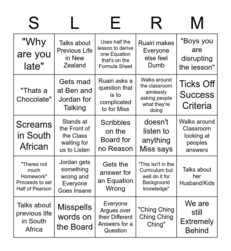 This bingo card has 35 words: Answers Phone Call, "Neiman", Counts in another Language, Gets mad at Ben and Jordan for Talking, Gets the answer for an Equation Wrong, Ruairi makes Everyone else feel Dumb, "Thats a Chocolate", Encourages Students to Abuse Each other, Ruairi asks a question that is to complicated to for Miss, gets mad at Nick and Christian for Talking, Screams in South African, "Boys you are disrupting the lesson", "My year 8 maths class...", Talks about Rugby, "Why are you late", doesn't listen to anything Miss says, "Ching Ching Ching Ching Ching", Stands at the Front of the Class waiting for us to Listen, "Theres not much Homework" Proceeds to set Half of Pearson, Scribbles on the Board for no Reason, "This isn't in the Curriculum but well do it for Background knowledge", Talks about previous life in South Africa, Talks about her Husband/Kids, Misspells words on the Board, Uses half the lesson to derive one Equation that's on the Formula Sheet, Ticks Off Success Criteria, We are still Extremely Behind, No one Understands what's happening in the lesson (Except Ruairi), Walks around the classroom aimlessly asking people what they're doing, Walks around Classroom looking at peoples answers, Relies on Students to find the Answer on their Calculators, Everyone Argues over their Different Answers for a Question, Jordan gets something wrong and Everyone Goes Insane, Talks about Previous Life in New Zealand and "where is your calculator".