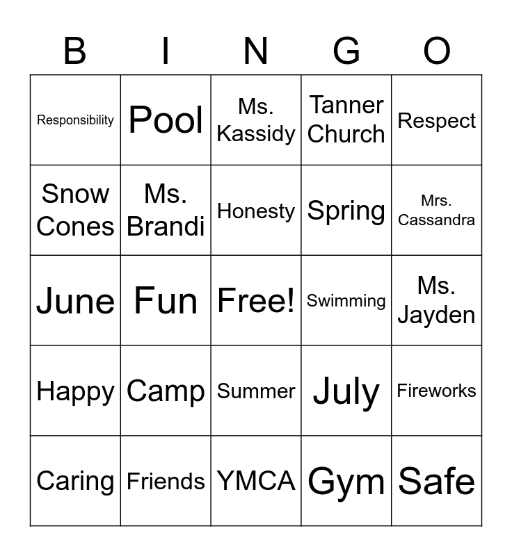 This bingo card has a free space and 25 words: Camp, YMCA, Honesty, Caring, Respect, Responsibility, Snow Cones, Pool, Swimming, Summer, Spring, June, July, Fireworks, Ms. Brandi, Ms. Madison, Ms. Jayden, Ms. Kassidy, Mrs. Cassandra, Fun, Safe, Friends, Happy, Tanner Church and Gym.