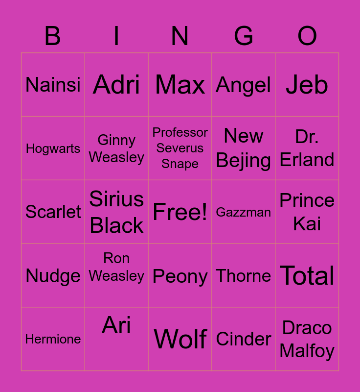 This bingo card has a free space and 44 words: Harry Potter, Draco Malfoy, Azkaban, Hermione, Voldemort, Cinder, Max, Iggy, Jeb, Ari, Angel, Gazzman, Peony, Ron Weasley, "The School", Wolf, Kaito, Scarlet, Levana, Dr. Erland, Adri, Iko, Pearl, Nainsi, Sybil, Prince Kai, Chang Sacha, Chang Sunto, Thorne, Nudge, Fang, Total, Ann Walker, Dumbledore, Sirius Black, Professor McGonagall, Doby, Tom Riddle, Professor Severus Snape, Hogwarts, New Bejing, Africa, Ginny Weasley and Three headed dog.