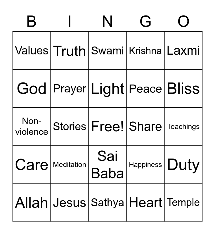 This bingo card has a free space and 27 words: Happiness, Love, Peace, Sathya, God, Swami, Truth, Care, Share, Duty, Non-violence, Krishna, Allah, Jesus, Bliss, Bhajan, Prayer, Light, Meditation, Values, Teachings, Heart, Stories, Temple, Sai Baba, Laxmi and Service.