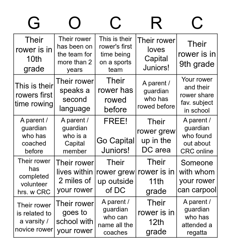 This bingo card has a free space and 24 words: Their rower lives within 2 miles of your rower, Their rower goes to school with your rower, Their rower has rowed before, Their rower is related to a varsity / novice rower, Their rower is in 9th grade, Their rower is in 10th grade, This is their rowers first time rowing, Their rower has been on the team for more than 2 years, Their rower grew up in the DC area, Their rower grew up outside of DC, A parent / guardian who has rowed before, A parent / guardian who has coached before, Their rower is in 11th grade, Someone with whom your rower can carpool, Their rower speaks a second language, Their rower is in 12th grade, A parent / guardian who found out about CRC online, This is their rower's first time being on a sports team, Your rower and their rower share fav. subject in school, A parent / guardian who is a Capital member, A parent / guardian who has attended a regatta, Their rower has completed volunteer hrs. w CRC, Their rower loves Capital Juniors! and A parent / guardian who can name all the coaches.