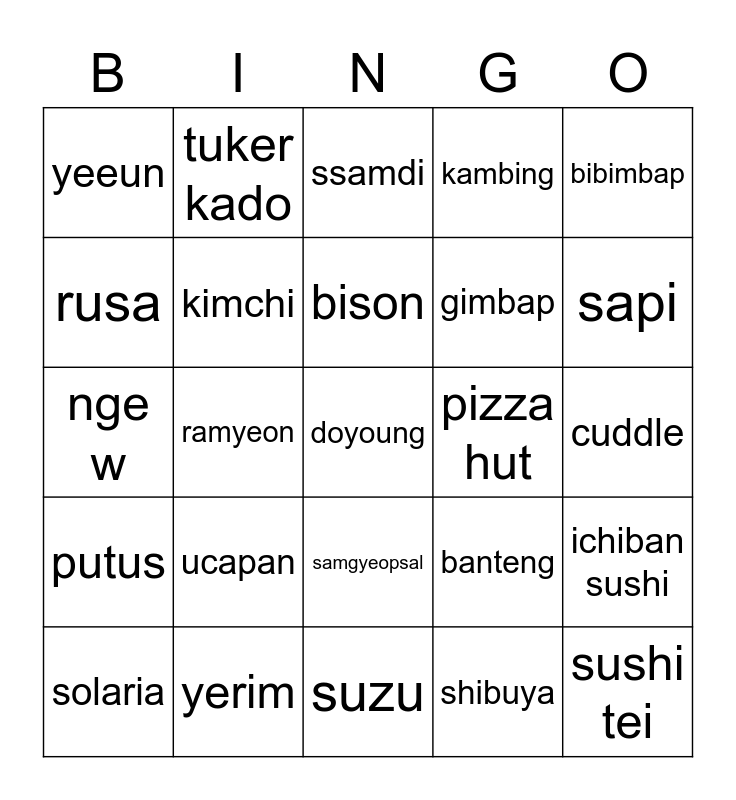 This bingo card has a free space and 24 words: ucapan, yerim, bison, solaria, bibimbap, yeeun, rusa, tuker kado, pizza hut, samgyeopsal, gimbap, nge w, banteng, ichiban sushi, kimchi, shibuya, cuddle, ssamdi, sapi, ramyeon, sushi tei, putus, kambing and suzu.