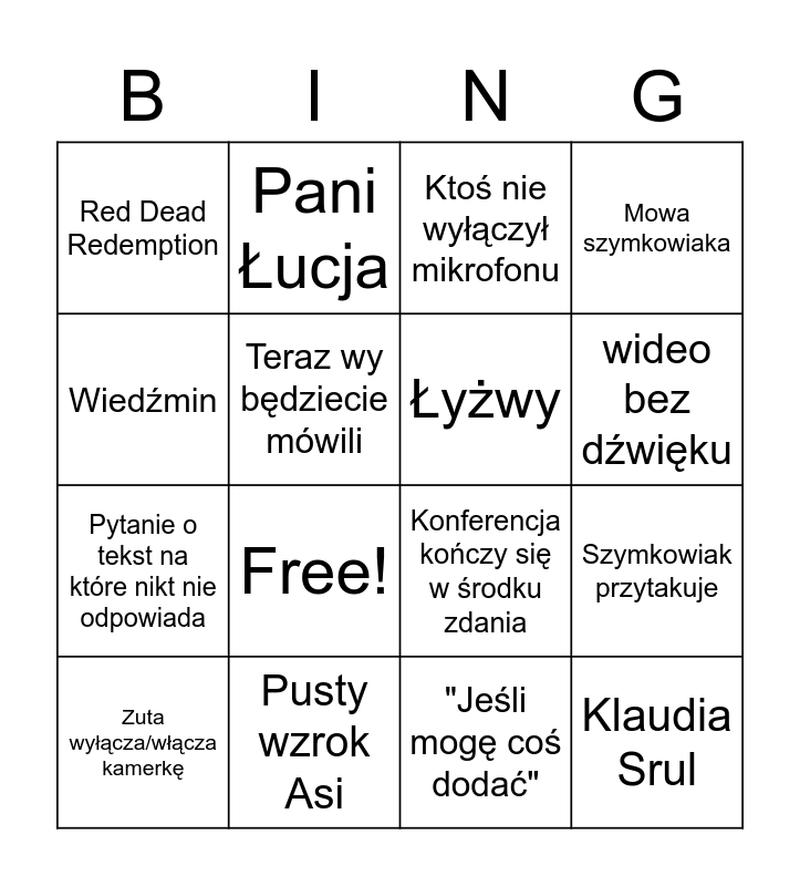 This bingo card has 16 words: Pusty wzrok Asi, Szymkowiak przytakuje, Ktoś nie wyłączył mikrofonu, Red Dead Redemption, Pytanie o tekst na które nikt nie odpowiada, Pani Łucja, Konferencja kończy się w środku zdania, "Jeśli mogę coś dodać", Wiedźmin, Teraz wy będziecie mówili, Zuta wyłącza/włącza kamerkę, Mowa szymkowiaka, Free!, wideo bez dźwięku, Łyżwy and Klaudia Srul.