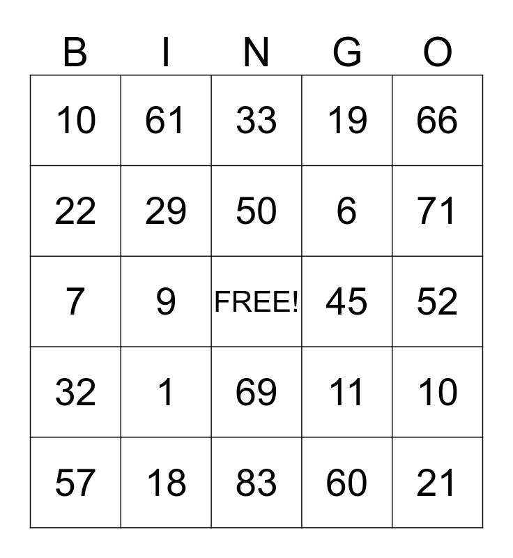 This bingo card has a free space and 24 words: 1, 18, 50, 57, 66, 10, 22, 61, 45, 69, 6, 7, 11, 10, 29, 60, 52, 33, 71, 9, 21, 32, 19 and 83.