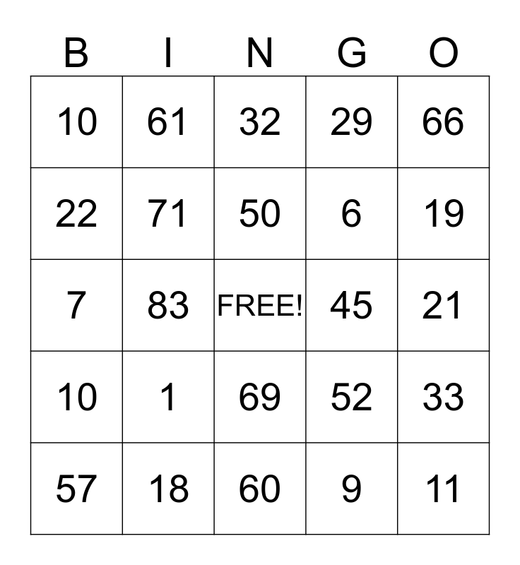 This bingo card has a free space and 24 words: 1, 18, 50, 57, 66, 10, 22, 61, 45, 69, 6, 7, 52, 33, 71, 9, 21, 32, 19, 83, 11, 10, 29 and 60.
