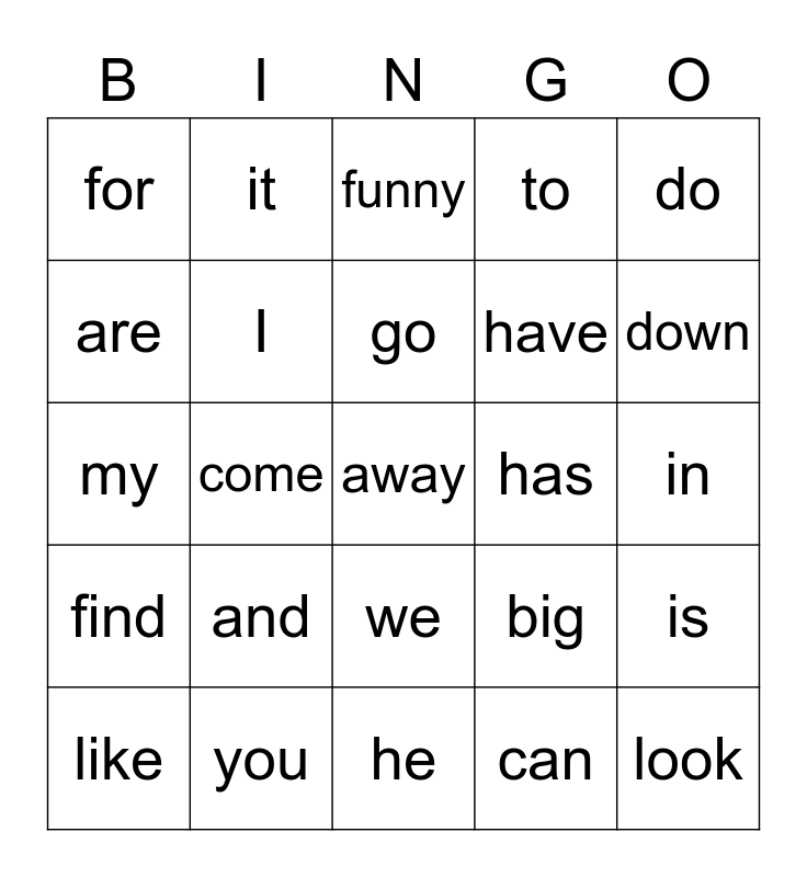This bingo card has a free space and 24 words: and, you, go, like, do, for, are, it, has, we, have, my, big, is, I, can, in, funny, down, come, look, find, to and he.