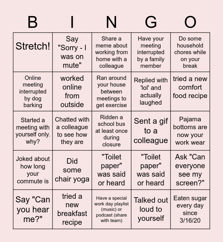This bingo card has a free space and 24 words: Say "Can you hear me?", Did some chair yoga, Ran around your house between meetings to get exercise, Talked out loud to yourself, Do some household chores while on your break, Stretch!, Say "Sorry - I was on mute", Share a meme about working from home with a colleague, Sent a gif to a colleague, Pajama bottoms are now your work wear, Started a meeting with yourself only. why?, worked online from outside, "Toilet paper" was said or heard, Ask "Can everyone see my screen?", Online meeting interrupted by dog barking, tried a new breakfast recipe, Have a special work day playlist (music) or podcast (share with team), Have your meeting interrupted by a family member, tried a new comfort food recipe, Joked about how long your commute is, Chatted with a colleague to see how they are, "Toilet paper" was said or heard, Replied with 'lol' and actually laughed and Eaten sugar every day since 3/16/20.