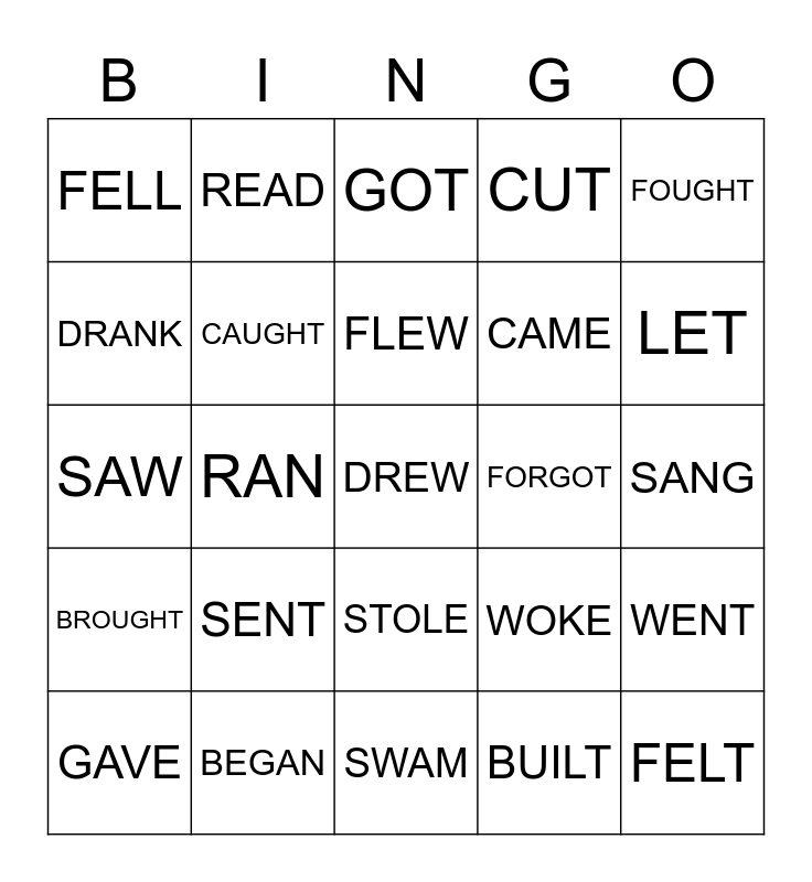 This bingo card has a free space and 59 words: WAS/WERE, BEGAN, BROKE, BROUGHT, BUILT, BOUGHT, CAUGHT, CHOSE, CAME, COST, CUT, DID, DRANK, DROVE, ATE, FELL, FELT, FOUGHT, FOUND, FLEW, FORGOT, GOT, GAVE, WENT, HAD, KEPT, KNEW, LEFT, LET, LOST, MADE, MET, PAID, PUT, READ, RODE, RANG, RAN, SAID, SAW, SOLD, SENT, SANG, SAT, SLEPT, SPOKE, SPENT, STOOD, STOLE, SWAM, TOOK, TAUGHT, TOLD, THOUGHT, UNDERSTOOD, WOKE, WORE, WON and WROTE.
