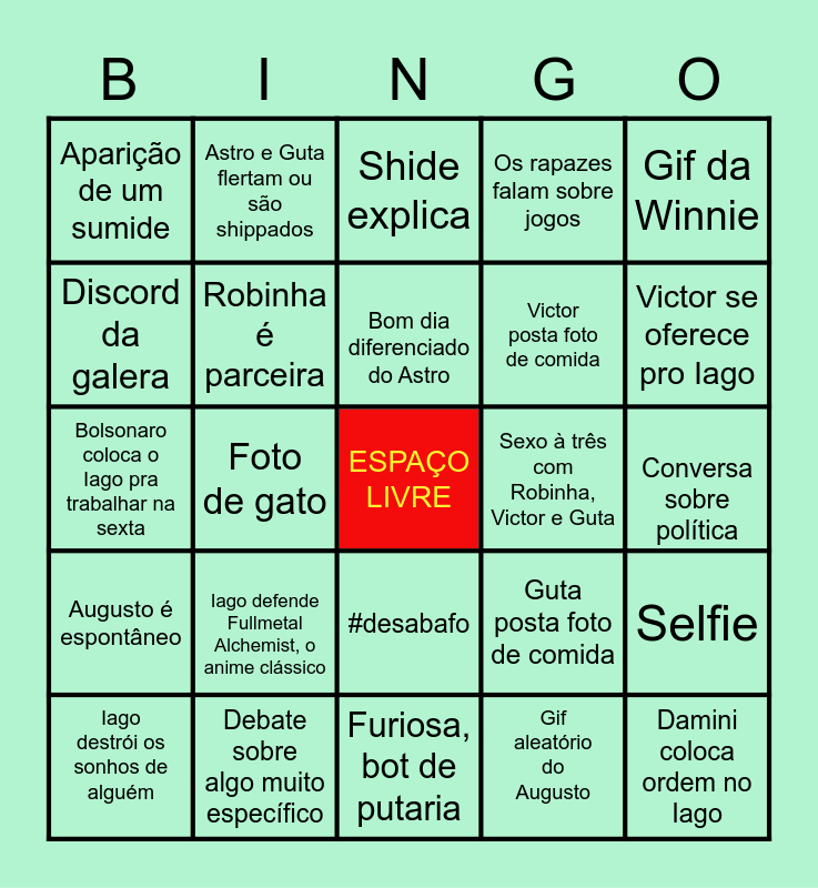 This bingo card has a free space and 24 words: Iago defende Fullmetal Alchemist, o anime clássico, Debate sobre algo muito específico, Bom dia diferenciado do Astro, Iago destrói os sonhos de alguém, Gif da Winnie, Aparição de um sumide, Discord da galera, Astro e Guta flertam ou são shippados, Sexo à três com Robinha, Victor e Guta, #desabafo, Victor posta foto de comida, Bolsonaro coloca o Iago pra trabalhar na sexta, Guta posta foto de comida, Selfie, Robinha é parceira, Gif aleatório do Augusto, Conversa sobre política, Shide explica, Victor se oferece pro Iago, Foto de gato, Damini coloca ordem no Iago, Augusto é espontâneo, Os rapazes falam sobre jogos and Furiosa, bot de putaria.