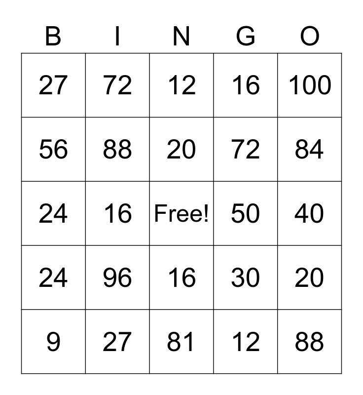 This bingo card has a free space and 120 words: 4, 6, 8, 10, 12, 14, 16, 18, 20, 22, 24, 6, 8, 10, 12, 14, 16, 20, 22, 24, 9, 12, 15, 18, 21, 24, 27, 30, 33, 36, 12, 16, 20, 24, 28, 32, 36, 40, 44, 48, 15, 20, 25, 30, 35, 40, 45, 50, 55, 60, 18, 24, 30, 36, 42, 48, 54, 60, 66, 72, 21, 28, 35, 42, 49, 56, 63, 70, 77, 84, 24, 32, 40, 48, 56, 64, 72, 80, 88, 96, 27, 36, 45, 54, 63, 72, 81, 90, 99, 108, 30, 40, 50, 60, 70, 80, 90, 100, 110, 120, 33, 44, 55, 66, 77, 88, 99, 110, 121, 132, 36, 48, 60, 72, 84, 96, 108, 120, 132 and 144.
