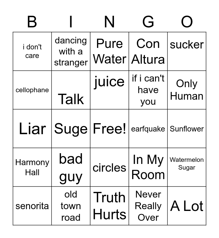 This bingo card has a free space and 24 words: bad guy, old town road, juice, senorita, sucker, i don't care, cellophane, dancing with a stranger, earfquake, circles, if i can't have you, Liar, In My Room, Watermelon Sugar, Talk, Never Really Over, Sunflower, Pure Water, Only Human, Suge, A Lot, Harmony Hall, Con Altura and Truth Hurts.