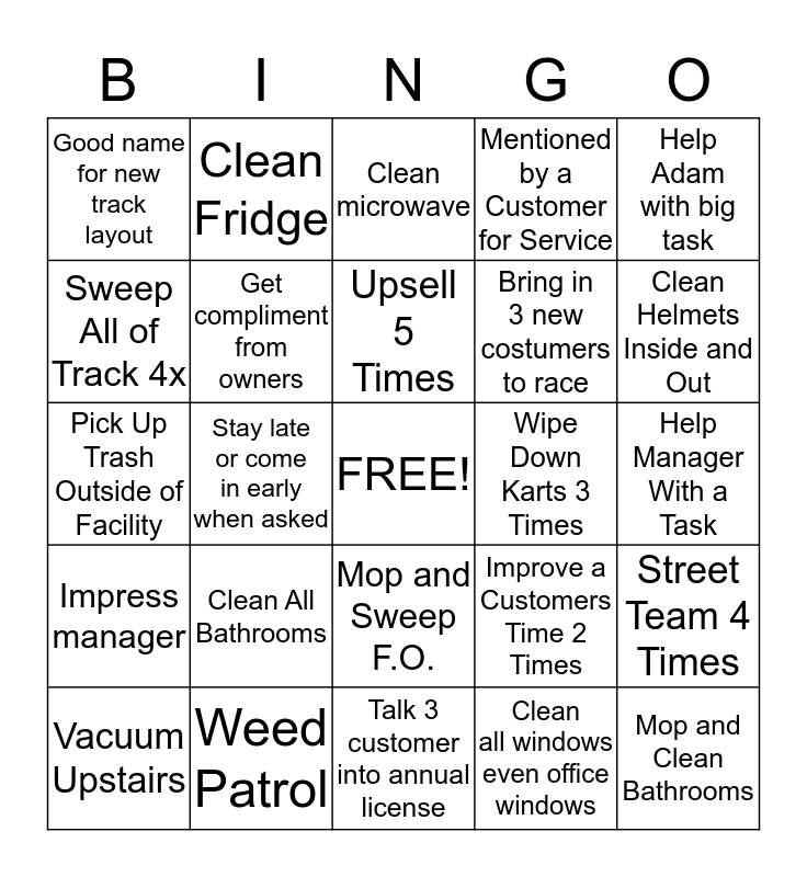 This bingo card has a free space and 24 words: Clean All Bathrooms, Weed Patrol, Upsell 5 Times, Vacuum Upstairs, Help Adam with big task, Good name for new track layout, Sweep All of Track 4x, Clean Fridge, Wipe Down Karts 3 Times, Mop and Sweep F.O., Bring in 3 new costumers to race, Pick Up Trash Outside of Facility, Improve a Customers Time 2 Times, Street Team 4 Times, Get compliment from owners, Clean all windows even office windows, Help Manager With a Task, Clean microwave, Clean Helmets Inside and Out, Stay late or come in early when asked, Mop and Clean Bathrooms, Impress manager, Mentioned by a Customer for Service and Talk 3 customer into annual license.