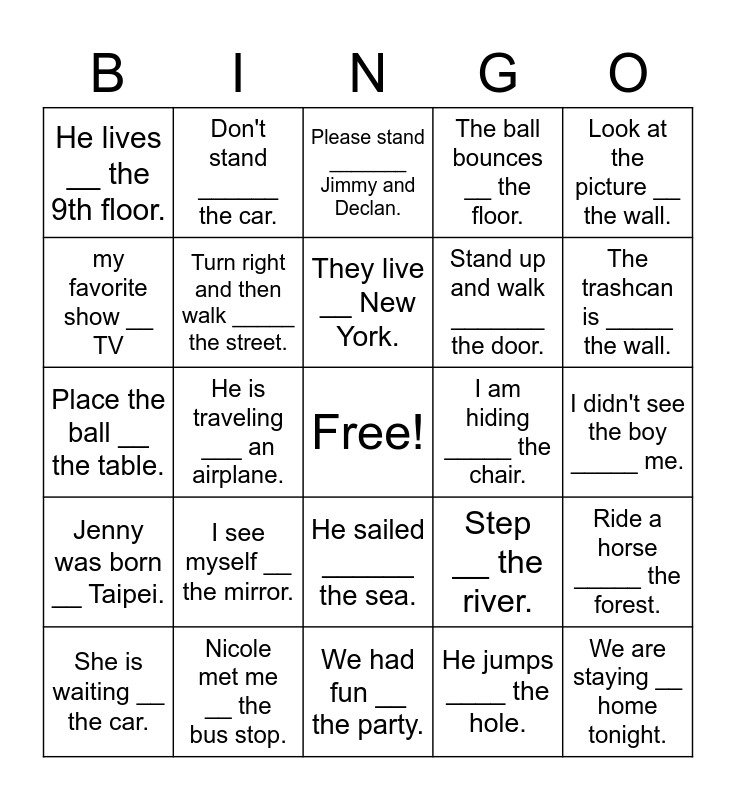 This bingo card has a free space and 24 words: I see myself __ the mirror., Nicole met me __ the bus stop., They live __ New York., She is waiting __ the car., Look at the picture __ the wall., He lives __ the 9th floor., my favorite show __ TV, Don't stand ______ the car., I am hiding _____ the chair., He sailed ______ the sea., Stand up and walk _______ the door., Place the ball __ the table., Step __ the river., Ride a horse _____ the forest., Turn right and then walk _____ the street., He jumps ____ the hole., I didn't see the boy _____ me., Please stand _______ Jimmy and Declan., The trashcan is _____ the wall., He is traveling ___ an airplane., We are staying __ home tonight., Jenny was born __ Taipei., The ball bounces __ the floor. and We had fun __ the party..