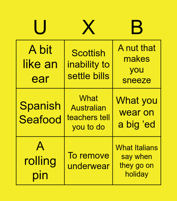 This bingo card has 12 words: How you address the duchess of Cambridge, What Italians say when they go on holiday, What Australian teachers tell you to do, What you wear on a big ’ed, Scottish inability to settle bills, A nut that makes you sneeze, To remove underwear, Jamaican Sunrise, A bit like an ear, Spanish Seafood, A rolling pin and Basil Brush.