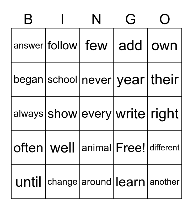 This bingo card has 25 words: well, around, never, until, own, answer, began, follow, write, animal, year, always, Free!, different, school, another, right, few, their, show, every, change, often, add and learn.