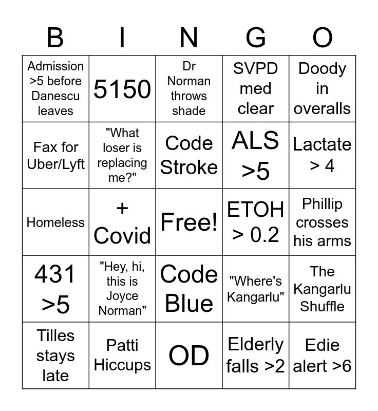 This bingo card has a free space and 24 words: "Hey, hi, this is Joyce Norman", Patti Hiccups, Code Stroke, Tilles stays late, Doody in overalls, Admission >5 before Danescu leaves, Fax for Uber/Lyft, 5150, ETOH > 0.2, Code Blue, ALS >5, Homeless, "Where's Kangarlu", The Kangarlu Shuffle, "What loser is replacing me?", Elderly falls >2, Phillip crosses his arms, Dr Norman throws shade, Lactate > 4, + Covid, Edie alert >6, 431 >5, SVPD med clear and OD.