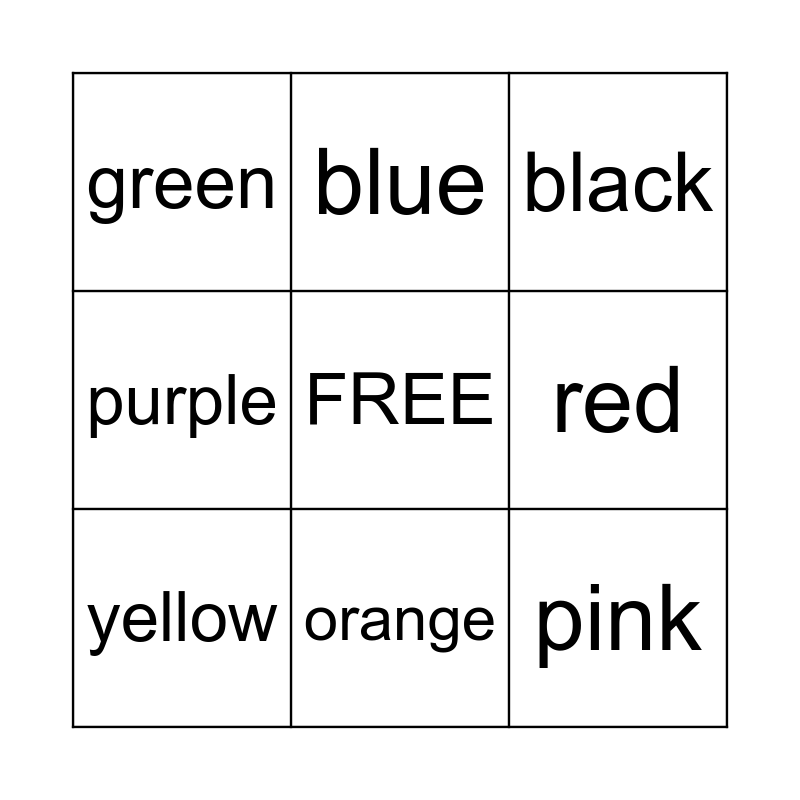 This bingo card has a free space and 8 words: red, black, blue, yellow, green, pink, purple and orange.