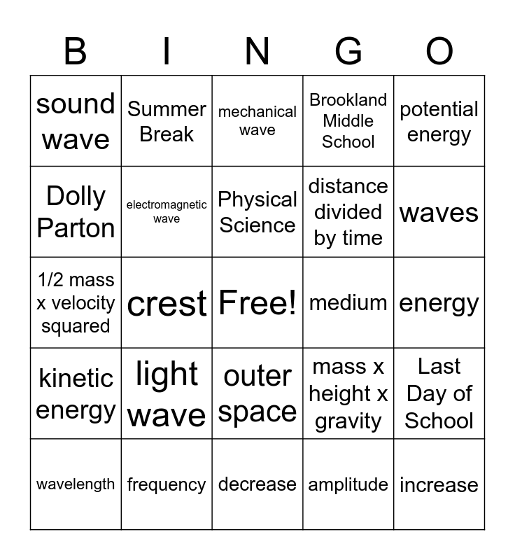 This bingo card has a free space and 29 words: wavelength, period, crest, trough, sound wave, mechanical wave, electromagnetic wave, light wave, medium, frequency, energy, increase, decrease, amplitude, waves, seismic wave, outer space, kinetic energy, potential energy, 1/2 mass x velocity squared, mass x height x gravity, chemical potential energy, distance divided by time, Dolly Parton, Brookland Middle School, Summer Break, Last Day of School, Physical Science and PROMOTION.