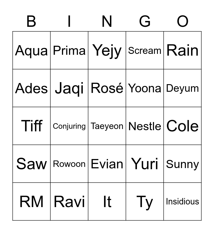 This bingo card has a free space and 24 words: Rowoon, Ravi, Rosé, RM, Rain, Aqua, Ades, Prima, Nestle, Evian, Yoona, Tiff, Yuri, Sunny, Jaqi, Ty, Cole, Yejy, Deyum, Conjuring, Insidious, Saw, Scream and It.