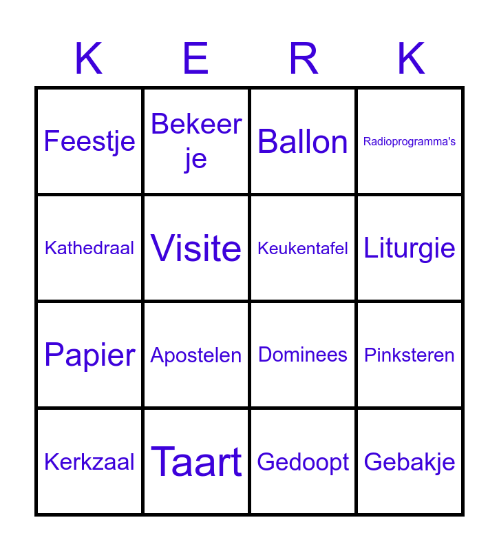 This bingo card has 16 words: Taart, Pinksteren, Ballon, Feestje, Papier, Bekeer je, Dominees, Gedoopt, Kathedraal, Visite, Kerkzaal, Radioprogramma's, Apostelen, Liturgie, Keukentafel and Gebakje.