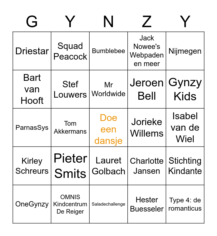 This bingo card has a free space and 161 words: #Henk, A.B.S. Comenius, Alfred Sengers, Anke van der Velde, Annelies Brouwer, Arie de Bonth, Asma El-haouli, Babet Moors, Baby Shark, Backlog, Bart van Hooft, Blackbeard, Bumblebee, Chantal Westenberg, Charlotte Jansen, Chris Vossen, Cloudwise, Cronopio, Daniel Genis, Danny Jongman, De PaasBazen, De Vuurvlinder, Den Bosch, Direwolf, Dirk Huijssoon, Doelenboekjes, Driestar, Dwayne Hanekamp, Eindhoven, Econocom, Ed Toussaint, Efiël Verwegen, Enneagram, Erik Goossens, Frank Koenders, Funnel Feeder, Gas erop, Gerben Baartman, Gynzylom, Gisny, Gynzy Kids, Gynzy maakt het digibord eenvoudig en effectief, Gynzy iPads, Gynzy iPads zonder iPads, Gynzy iPads zonder iPads met Chromebooks, Gynzy Werelden, Grow as you go, Hannah van Beek, Happy Teacher, Happy Kids, HCS, Hein Wittgen, Help ons jou helpen, Hengelo, Hester Buesseler, Heutink aktie, Huddle Centrum, Huddle spoor, Hydra, icebox, Inge Kwanten, Isabel van de Wiel, Jack Nowee's Webpaden en meer, Jan Lightart, Jan van Hooffstraat, Eindhoven, Jean-Pierre Deckers, Jeroen Bell, Joël Luijmes, Johan van der Laak, Joke Kemps, Jorieke Willems, Just DANS, Justin Mol, Keizer Karelplein, Kirley Schreurs, Koen Geluk, Koen Sengers, Lauret Golbach, Linda Beestman, Lotte Peerlings, Maven Repository, Maarten Reijmerink, Mammoth, Mand, Manon Beuker, Marianne Bins, Martijn Lenderink, Matthijs Bloemendal, Michael Wickham, Michiel Rheiter, Mieke Heuvels, Mila Abrahamse, Monorepo, Mr Worldwide, Nathalie Habets, Nijmegen, Nick Lubbers, Nidia van Gent, Nienke Laagland, Nina Snellaars, O21, OAuth access token, OMNIS Kindcentrum De Reiger, OneGynzy, ParnasSys, Pieter Smits, Pipedrive, Project Toekan, PubSub, Quarantaine Y Tres, R.K.B.S. De Bataaf, Ralf Schimmel, Raptor, Readspeaker, Rene Kranendonk, ResourceOwnerID, Rutger Peters, Ruud van de Laar, Saber, Saladechallenge, Samen steeds beter, Scrum of scrums, Sjors Stassen, Squad Bald Eagle, Squad Blackbeard, Squad Bumblebee, Squad Deans, Squad Direwulf, Squad Griffin, Squad Hydra, Squad Mammoth, Squad Peacock, Squad Pegasus, Squad Saber, Squad T-rex, Squad Unicorn, Squad Yeti, Stationsplein, Den Bosch, Stef Louwers, Stichting Kindante, Stoere mannen, Tanja van den Tillaart, Tessa de Wijs, Tom Akkermans, Topicus, T-Rex, Type 3: de winnaar, Type 4: de romanticus, Type 9: de bemiddelaar, Unicorn, Uniek onderwijs voor elkaar, Valerie Rutjes, Valetta, Vincent Hoftijzer, Virko, vtiger CRM, White Walkers, Wouter van den Borne, Xando, Yeti, Yvonne Beunders and ТРИ ПОЛОСКИ.