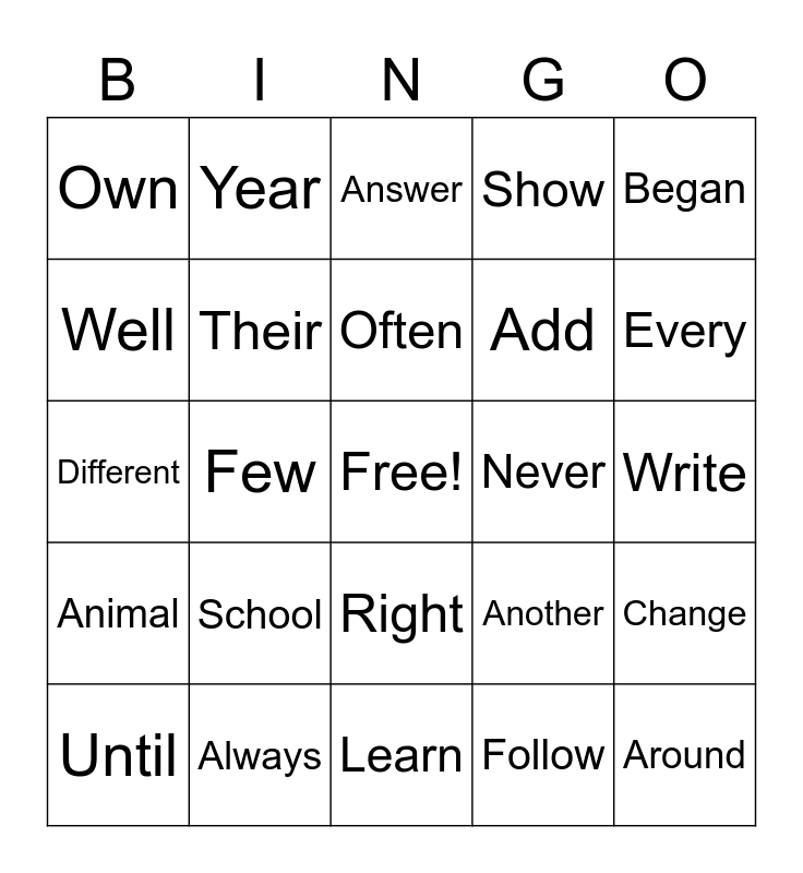This bingo card has a free space and 24 words: School, Always, Often, Until, Began, Own, Well, Year, Never, Right, Add, Different, Another, Change, Their, Follow, Write, Answer, Every, Few, Around, Animal, Show and Learn.