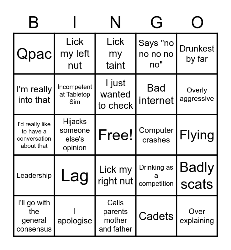This bingo card has a free space and 24 words: Lag, I apologise, I just wanted to check, I'll go with the general consensus, Drunkest by far, Qpac, I'm really into that, Lick my left nut, Computer crashes, Lick my right nut, Bad internet, I'd really like to have a conversation about that, Drinking as a competition, Badly scats, Incompetent at Tabletop Sim, Cadets, Flying, Lick my taint, Overly aggressive, Hijacks someone else's opinion, Over explaining, Leadership, Says "no no no no no" and Calls parents mother and father.