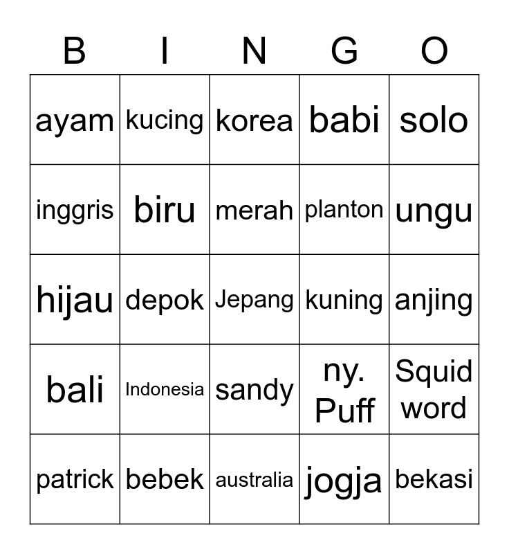 This bingo card has a free space and 24 words: Indonesia, bebek, merah, patrick, solo, ayam, inggris, kucing, kuning, sandy, planton, hijau, ny. Puff, Squid word, biru, jogja, anjing, korea, ungu, depok, bekasi, bali, babi and australia.