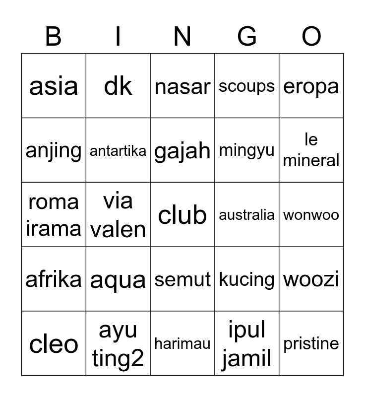 This bingo card has a free space and 24 words: aqua, ayu ting2, gajah, cleo, eropa, asia, anjing, dk, australia, semut, mingyu, roma irama, kucing, woozi, antartika, ipul jamil, wonwoo, nasar, le mineral, via valen, pristine, afrika, scoups and harimau.