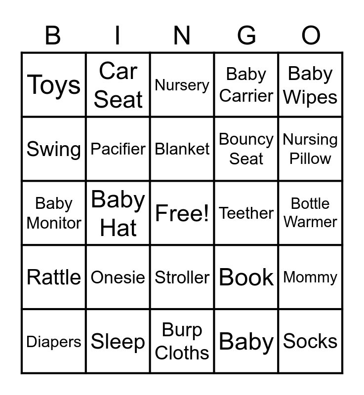This bingo card has a free space and 34 words: Bottle, Baby, Milk, Crib, Rattle, Pacifier, Baby Wipes, Diapers, Car Seat, Bib, Blanket, Nursery, Baby Tub, Rattle, Teether, Nursing Pillow, Sleep, Baby Monitor, Onesie, Book, Stroller, Diaper Bag, Toys, Bottle Warmer, Burp Cloths, Socks, Baby Carrier, Teddy Bear, Bouncy Seat, Swing, Name, Baby Hat, Mommy and Daddy.