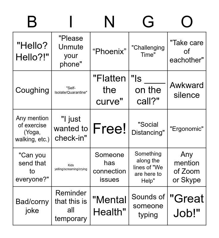 This bingo card has a free space and 47 words: "Covid-19/Coronavirus", "Great Job!", Barking or another animal sound, "Mental Health", Kids yelling/screaming/crying, "Please mute your phone", "Please Unmute your phone", LOUD feedback, Coughing, "Code 699", "Self-Isolate/Quarantine", "Challenging Time", Any mention of Zoom or Skype, Something along the lines of "We are here to Help", "Uncertain Times", "Pandemic", "Flatten the curve", "Social Distancing", "Stay Safe!", "Take care of eachother", "I just wanted to check-in", Sounds of someone typing, "Hello? Hello?!", "Is ____ on the call?", Cutting in and out, Awkward silence, Bad/corny joke, "How is everyone???", Someone has connection issues, "Can you send that to everyone?", More than 2 acronyms in a sentence, "Vaccine", Any weather talk, Meeting starts late, Construction Noises, Reminder that this is all temporary, "Ergonomic", Any mention of our Key work programs, “Schoolwork / Homeschooling”, Visa Offices/overseas, “Budget”, “Phoenix”, Any mention of exercise (Yoga, walking, etc.), Any mention of temporary workers, Reintegration, Transition and New normal.