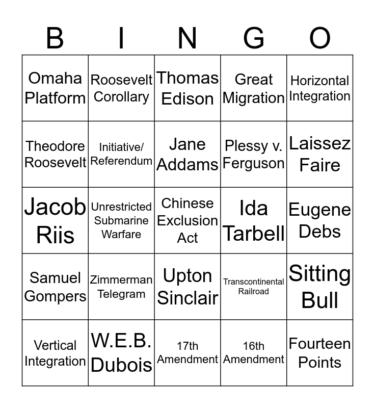 This bingo card has a free space and 24 words: Zimmerman Telegram, W.E.B. Dubois, Jane Addams, Vertical Integration, Horizontal Integration, Omaha Platform, Theodore Roosevelt, Roosevelt Corollary, Ida Tarbell, Upton Sinclair, Plessy v. Ferguson, Jacob Riis, Transcontinental Railroad, Sitting Bull, Initiative/ Referendum, 16th Amendment, Eugene Debs, Thomas Edison, Laissez Faire, Unrestricted Submarine Warfare, Fourteen Points, Samuel Gompers, Great Migration and 17th Amendment.