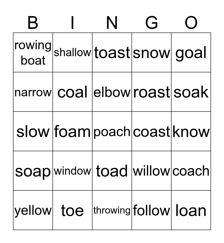 This bingo card has a free space and 24 words: window, toe, elbow, yellow, goal, rowing boat, narrow, shallow, coast, toad, roast, slow, willow, coach, coal, follow, know, toast, soak, foam, loan, soap, snow and throwing.