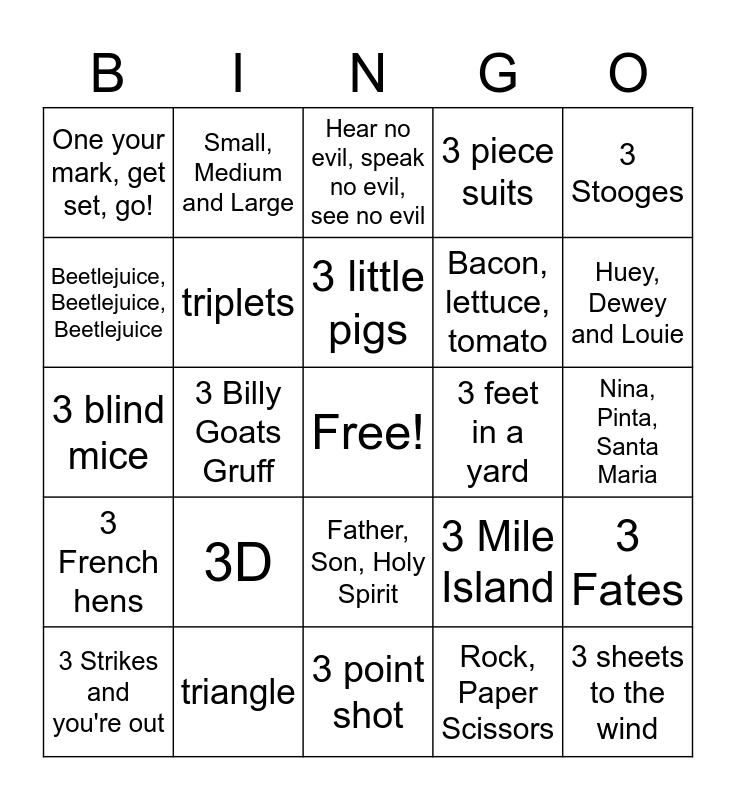 This bingo card has a free space and 40 words: 3 ring circus, 3 blind mice, primary colors, triplets, triangle, Father, Son, Holy Spirit, 3 little pigs, Past, Present, Future, 3 Stooges, 3 French hens, 3 Billy Goats Gruff, 3 piece suits, 3 sheets to the wind, Nina, Pinta, Santa Maria, 3 feet in a yard, 3D, 3-legged race, One your mark, get set, go!, Of the people,by the people, for the people, Hear no evil, speak no evil, see no evil, 3 Fates, Rock, Paper Scissors, Bacon, lettuce, tomato, Beetlejuice, Beetlejuice, Beetlejuice, Up, up and away, Peter, Paul and Mary, Triple Crown, 3 Bears, 3 Course meal, 3 Coins in a Fountain, 3 Wise Men, 3 Strikes and you're out, 3 Musketeers, 3 Mile Island, Huey, Dewey and Louie, 3 point shot, 3-legged stool, The Good, the Bad and the Ugly, Small, Medium and Large and Life, Liberty and the Pursuit of Happiness.