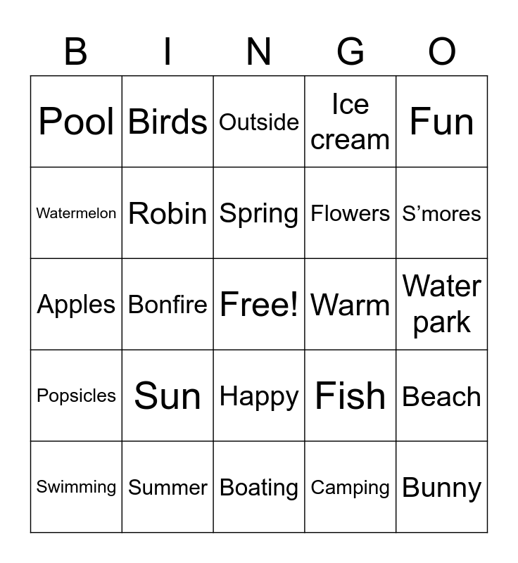 This bingo card has a free space and 24 words: Sun, Summer, Spring, Swimming, Fun, Pool, Watermelon, Birds, Warm, Happy, Flowers, Apples, Fish, Beach, Robin, Camping, Water park, Outside, S’mores, Bonfire, Bunny, Popsicles, Ice cream and Boating.