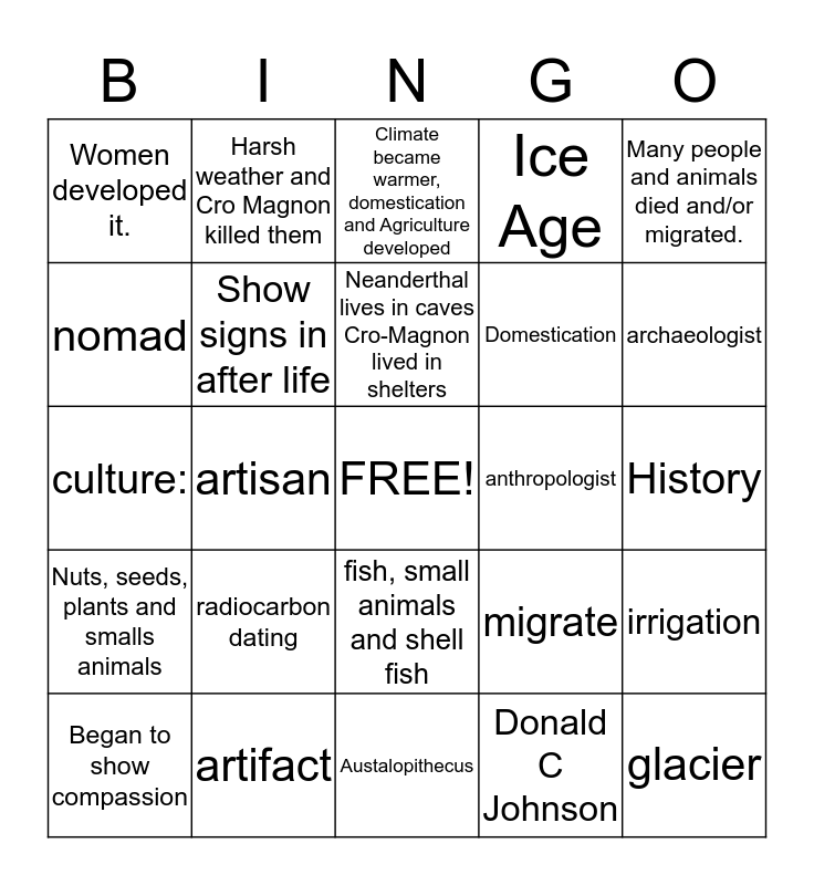 This bingo card has a free space and 34 words: Anthropologist and Archeologist studied artifacts and fossils Radiocarbon dating, Donald C Johnson, Beatles Song Lucy in the sky with diamond, Work together, communicate make tools, Nuts, seeds, plants and smalls animals, Show signs in after life, Many people and animals died and/or migrated., Began to show compassion, Harsh weather and Cro Magnon killed them, fish hooks, knives, arrow heads, light spears etc.., Neanderthal lives in caves Cro-Magnon lived in shelters, Climate became warmer, domestication and Agriculture developed, Prehistory, civilization, anthropologist, archaeologist, artifact, culture:, radiocarbon dating, migrate, fish, small animals and shell fish, The ability to grow own food and have surplus, Women developed it., History, Austalopithecus, glacier, Ice Age, Agriculture, Domestication, nomad, Neolithic Revolution, artisan, irrigation and fossil.