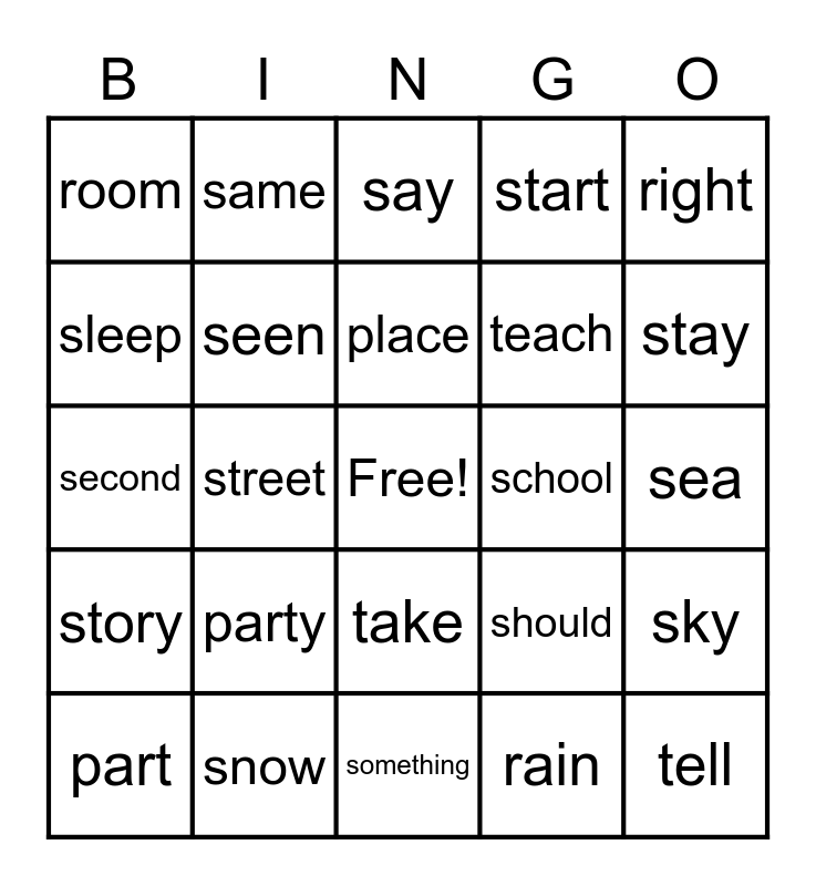This bingo card has a free space and 24 words: part, party, place, rain, right, room, same, say, school, sea, second, seen, should, sky, sleep, snow, something, start, stay, story, street, take, teach and tell.