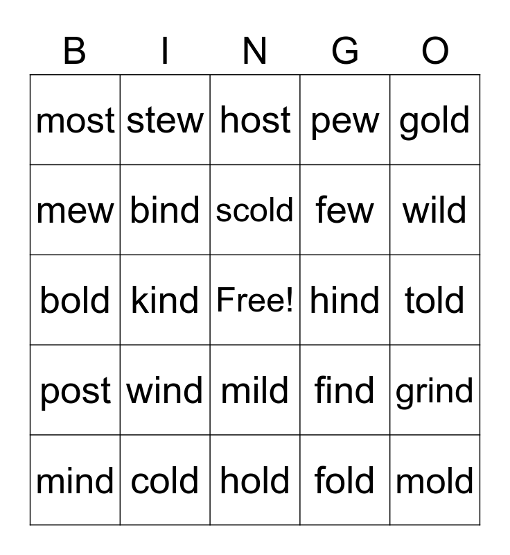 This bingo card has a free space and 29 words: mind, mild, kind, child, most, host, bind, wind, hind, cold, told, mold, hold, fold, wild, child, mild, post, gold, bold, find, grew, few, mew, pew, stew, grind, scold and flew.