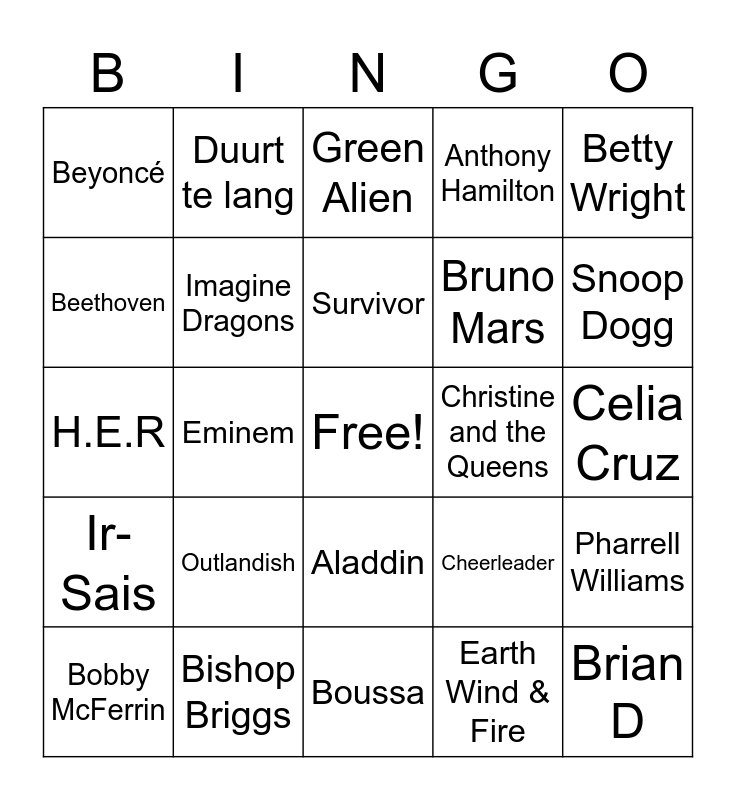 This bingo card has a free space and 54 words: 3T, Ir-Sais, Aaliyah, Afro B, Aladdin, Anitta & JBalvin, Anthony Hamilton, Aya Nakamura, Beethoven, Harry Belafonte, Beyoncé, Billie Eilish, Bishop Briggs, Bobby McFerrin, Bob Marley, Boussa, Brian D, Bruno Mars, Cars Disney, Celia Cruz, Cheerleader, Chic, Christine and the Queens, Betty Wright, Common Mary J Blige, Duurt te lang, Frozen, Rihanna, Dua Lipa, Earth Wind & Fire, Ed Sheeran, Ella Mai, Elvis Presley, Erykah Badu, Green Alien, Gyptian, H.E.R, Pharrell Williams, Henrique e Juliano, Imagine Dragons, Destiny Childs, Ivete Sangalo, Adele, Justin Bieber, Outlandish, Kenny B, Nielson, Coldplay, Survivor, Eminem, Snoop Dogg, Shiny Moana, Machel Montano and Luther Vandross.