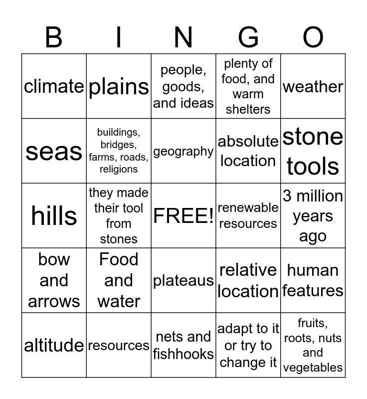 This bingo card has a free space and 24 words: Food and water, resources, geography, altitude, weather, climate, seas, plains, renewable resources, plateaus, absolute location, hills, relative location, human features, buildings, bridges, farms, roads, religions, adapt to it or try to change it, 3 million years ago, people, goods, and ideas, stone tools, they made their tool from stones, fruits, roots, nuts and vegetables, bow and arrows, plenty of food, and warm shelters and nets and fishhooks.