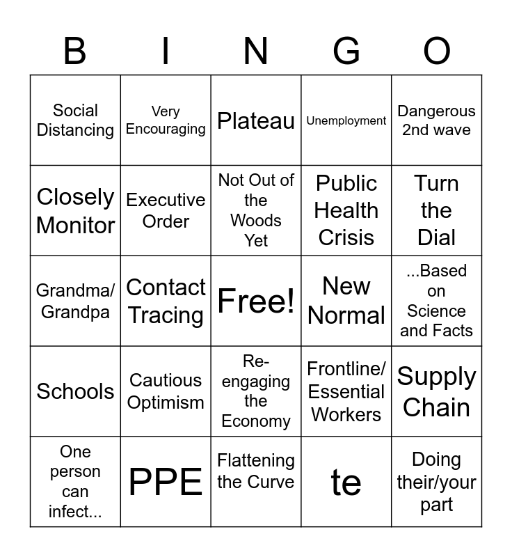 This bingo card has a free space and 25 words: Cautious Optimism, Flattening the Curve, Not Out of the Woods Yet, One person can infect..., Dangerous 2nd wave, Social Distancing, Closely Monitor, Very Encouraging, New Normal, Re-engaging the Economy, Public Health Crisis, Grandma/ Grandpa, Frontline/ Essential Workers, Supply Chain, Executive Order, Stay Home, ...Based on Science and Facts, Plateau, Turn the Dial, Contact Tracing, Doing their/your part, PPE, Schools, Unemployment and te.