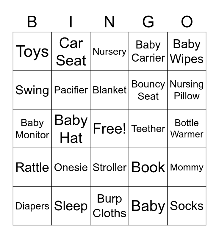 This bingo card has a free space and 34 words: Bottle, Baby, Milk, Crib, Rattle, Pacifier, Baby Wipes, Diapers, Car Seat, Bib, Blanket, Nursery, Baby Tub, Rattle, Teether, Nursing Pillow, Sleep, Baby Monitor, Onesie, Book, Stroller, Diaper Bag, Toys, Bottle Warmer, Burp Cloths, Socks, Baby Carrier, Teddy Bear, Bouncy Seat, Swing, Name, Baby Hat, Mommy and Daddy.