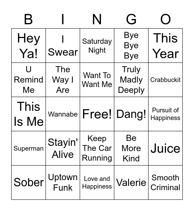 This bingo card has a free space and 30 words: Uptown Funk, Vacation, Wannabe, Dynamite, Hey Ya!, Saturday Night, The Way I Are, Keep The Car Running, Dang!, Love and Happiness, Pursuit of Happiness, Smooth Criminal, Valerie, Respect, Crabbuckit, RedBone, Be More Kind, Superman, Stayin' Alive, This Year, This Is Me, Blinded by the Light, I Swear, Truly Madly Deeply, U Remind Me, Bye Bye Bye, Juice, Sober, Want To Want Me and Dancing on My Own.
