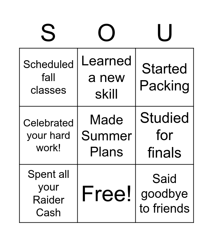 This bingo card has a free space and 8 words: Studied for finals, Started Packing, Learned a new skill, Spent all your Raider Cash, Scheduled fall classes, Said goodbye to friends, Celebrated your hard work! and Free!.