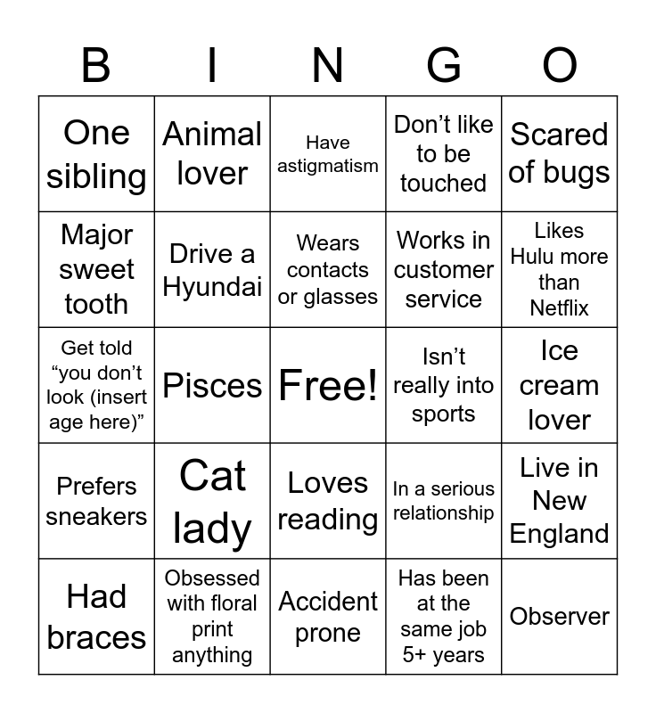This bingo card has a free space and 24 words: Cat lady, Obsessed with floral print anything, Wears contacts or glasses, Had braces, Scared of bugs, One sibling, Major sweet tooth, Animal lover, Isn’t really into sports, Loves reading, Works in customer service, Get told “you don’t look (insert age here)”, In a serious relationship, Live in New England, Drive a Hyundai, Has been at the same job 5+ years, Ice cream lover, Have astigmatism, Likes Hulu more than Netflix, Pisces, Observer, Prefers sneakers, Don’t like to be touched and Accident prone.